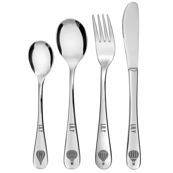 - Each piece of cutlery is laser engraved with a hot air balloon design and the child's name